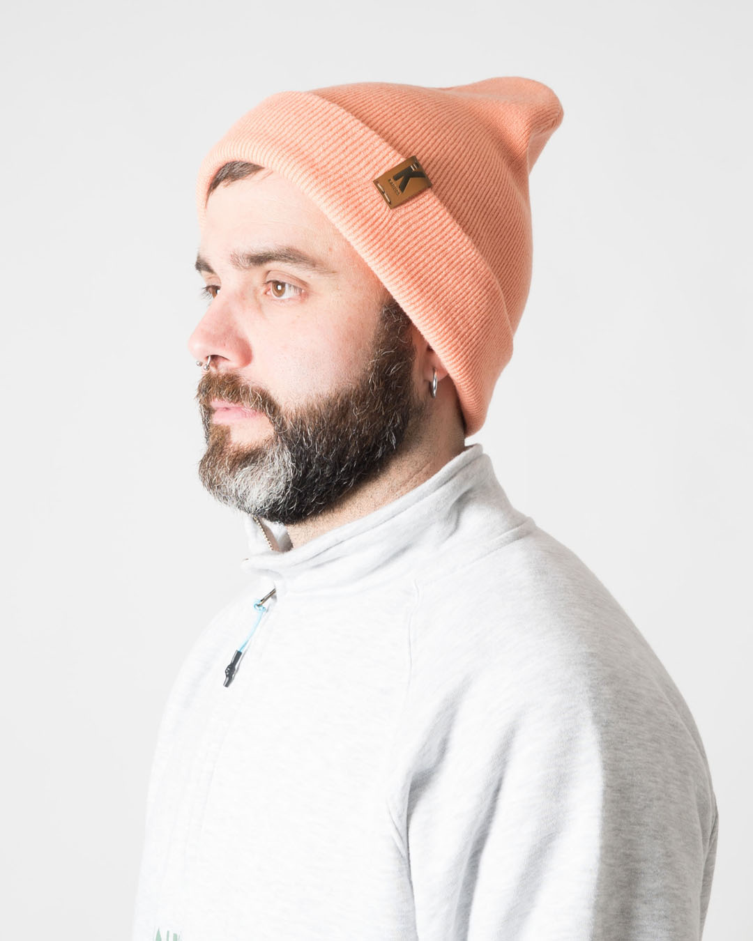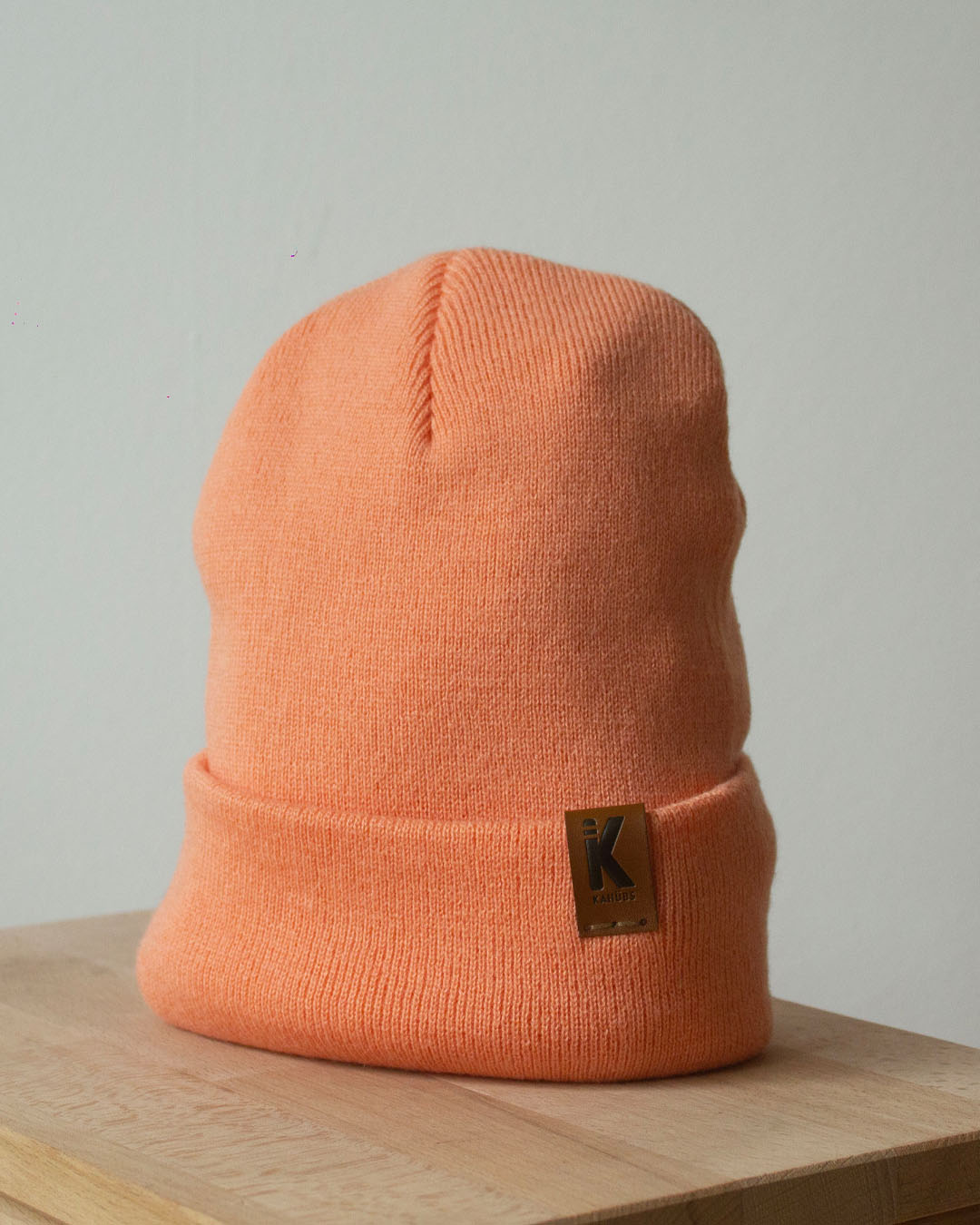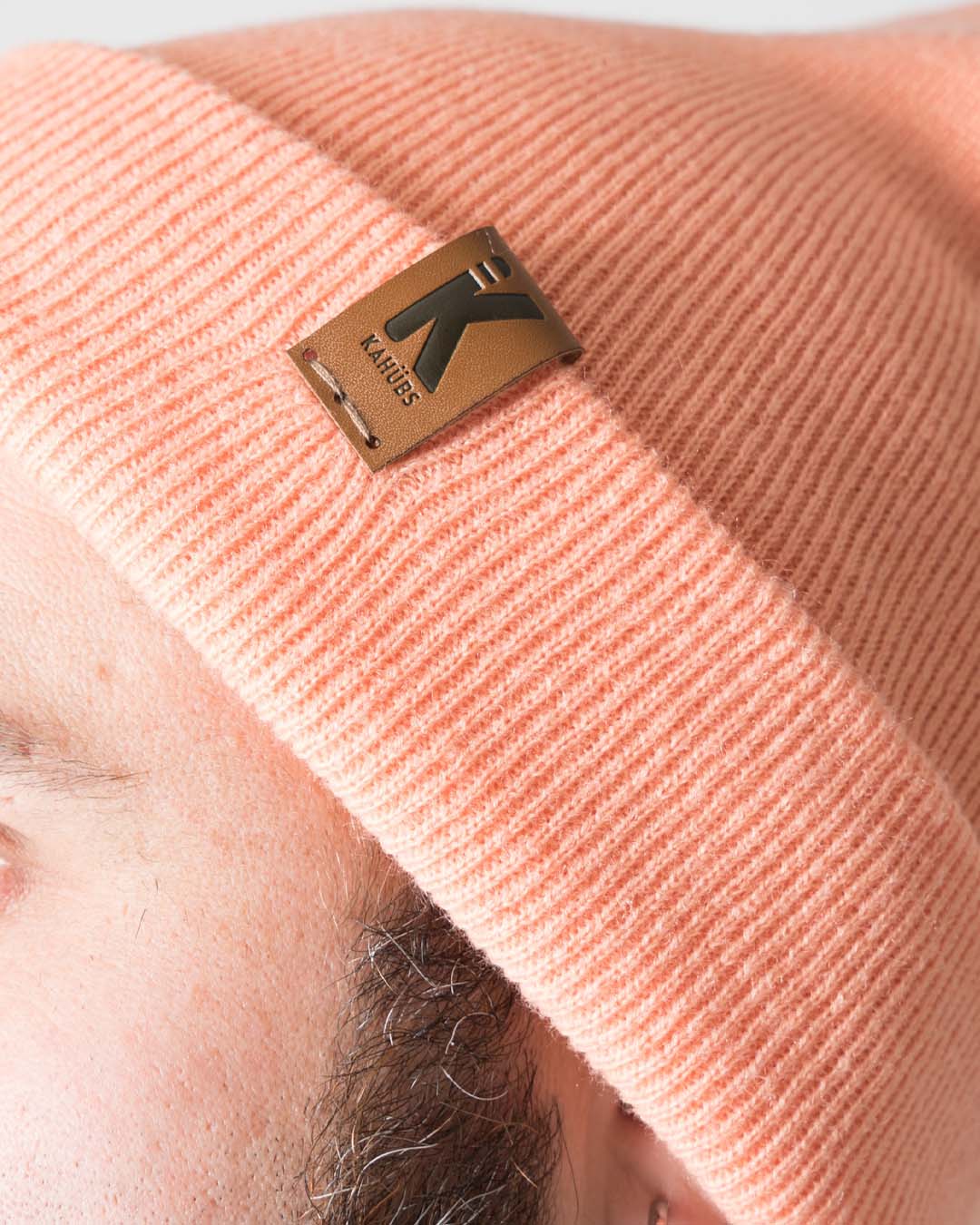 Detalle dela marca en polipiel al costado del Gorro Beanie.