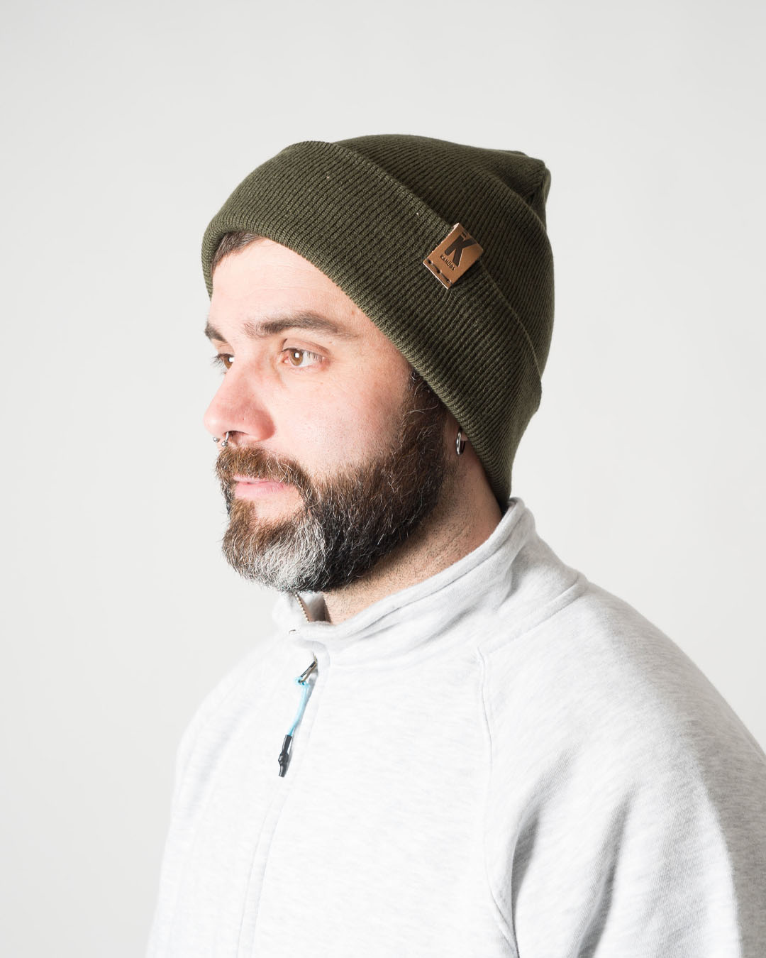 Detalle dela marca en polipiel al costado del gorro beanie.