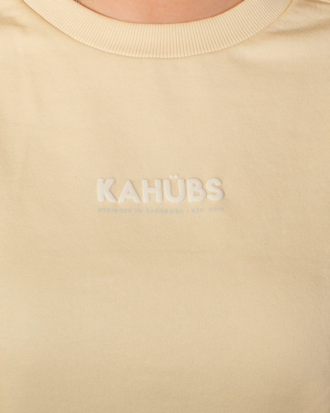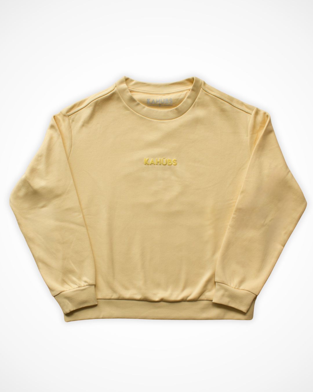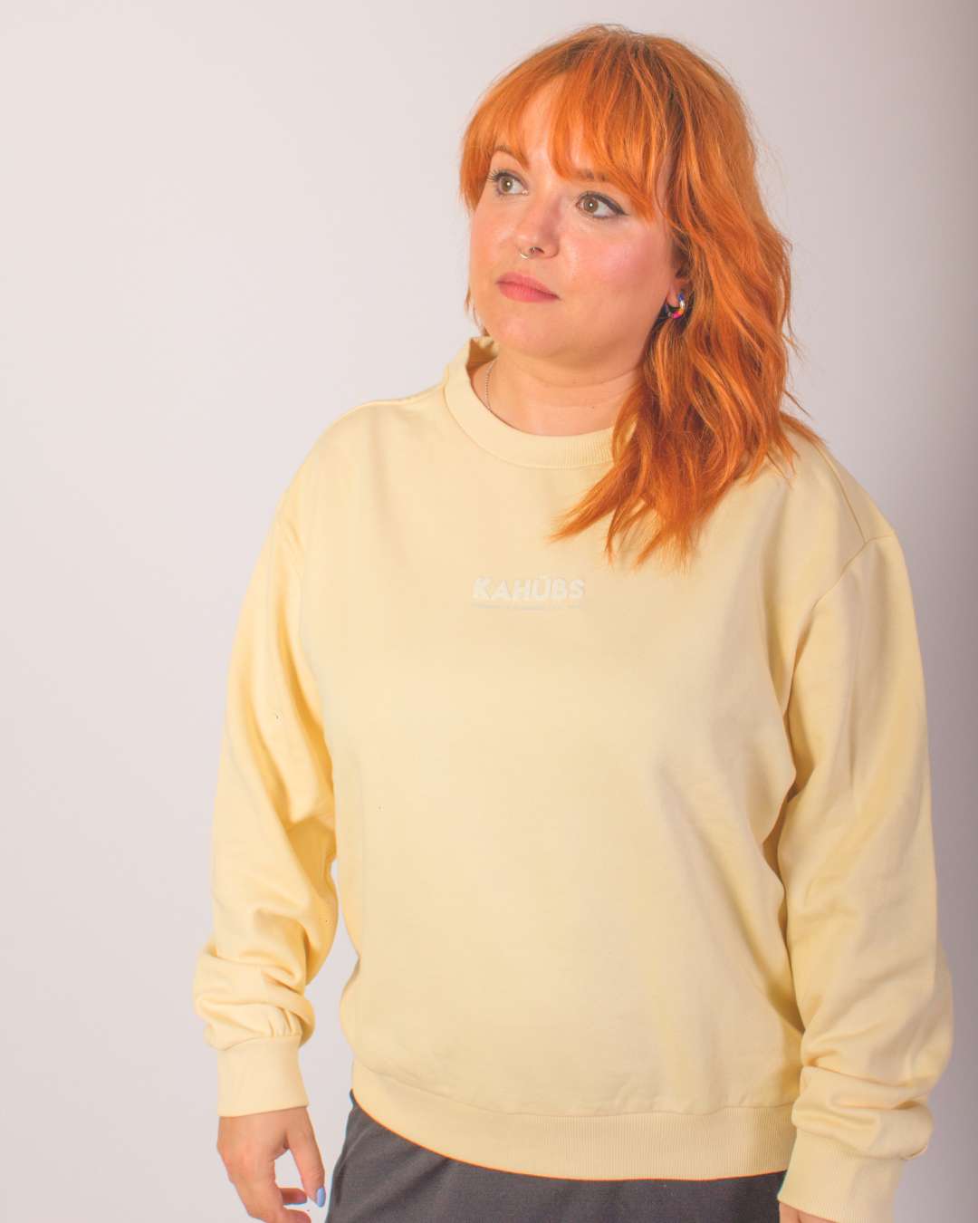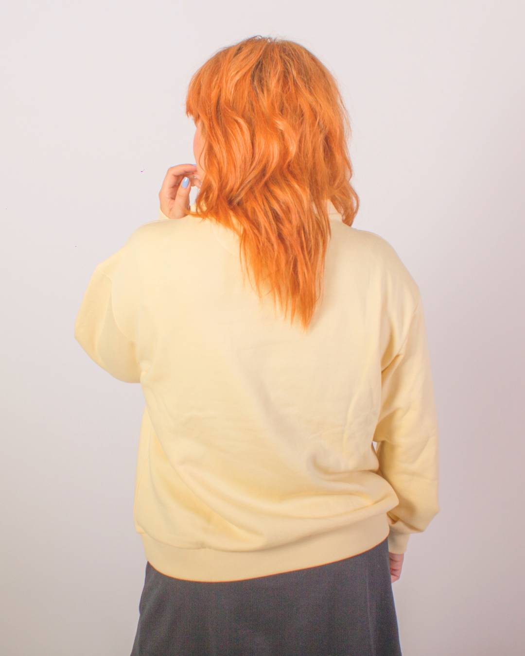 Sudadera cuello redondo en color amarillo limón, confeccionada en mezcla de algodón orgánico y polyester de corte oversize. Cuenta con marca en relieve en el torso. La modelo lleva una talla M.